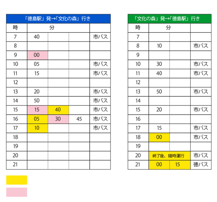 徳島市営バス3番のりば「文化の森」行き直通バスに乗車し約20分、終点「文化の森」で下車。