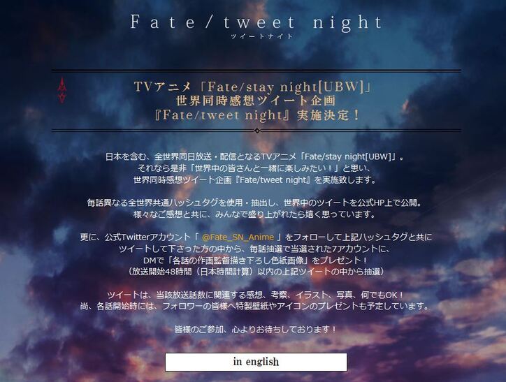 1stシーズンでも開催した『Fate/tweet night』を2ndシーズンでも開催致します!